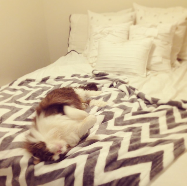 He spends most of his time being terrified and hiding behind the toilet, but if he really wants something from me he’ll sprawl out on my bed. Men. They’re all the same.